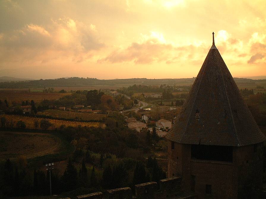 城壁の上からの眺め。眼下には、ラングドック地方ののどかな田園風景が広がる。