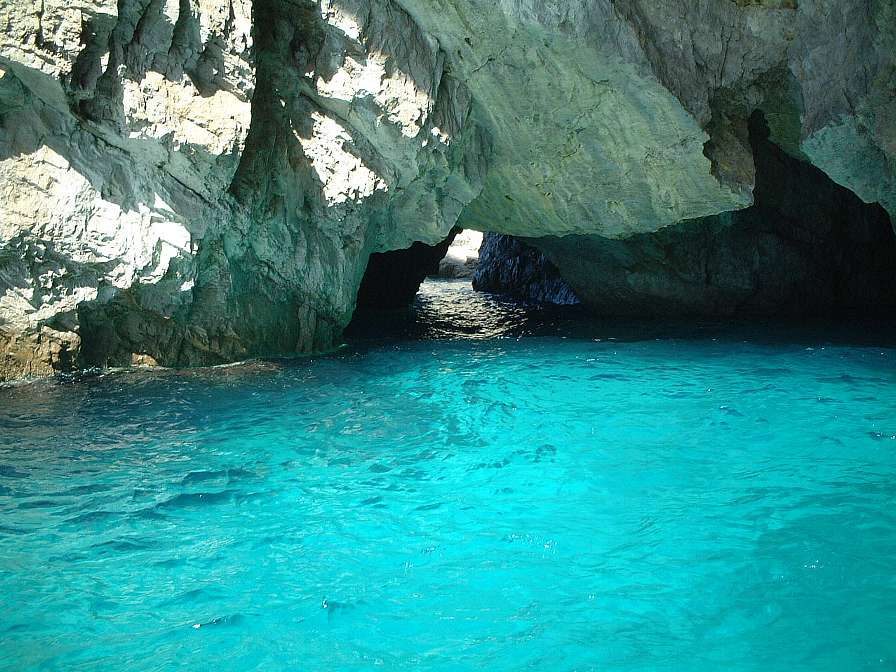 「緑の洞窟」(Grotta Verde) 太陽光線で水がエメラルドグリーンに輝いている。
