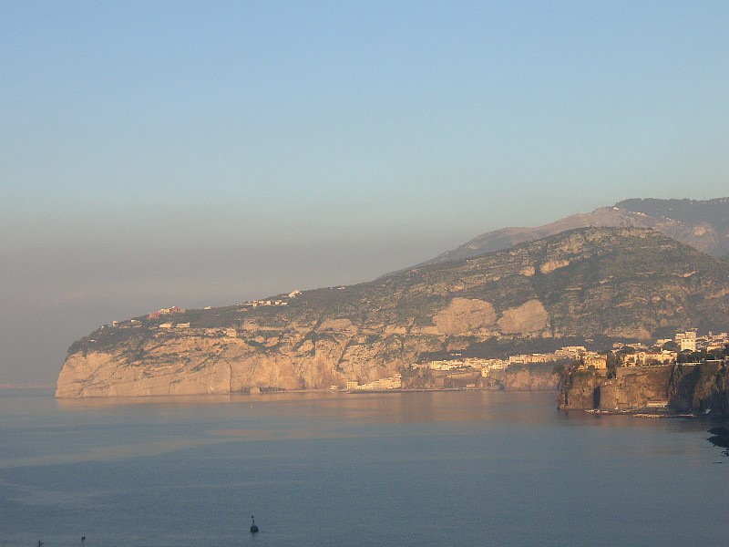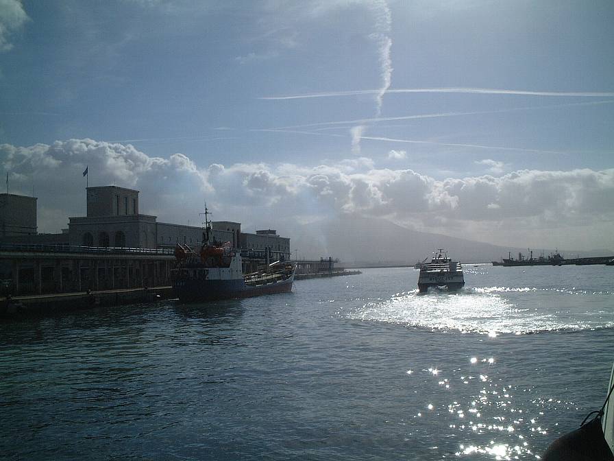 ナポリ湾から出航する。遠方にはヴェスビオ火山がうっすらと見える。