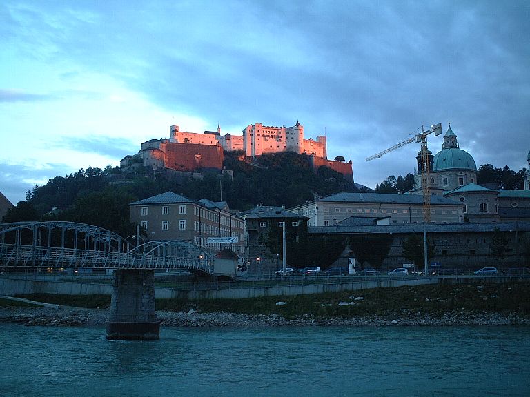 ザルツァッハ川(Salzach)の彼方に夕日が沈む