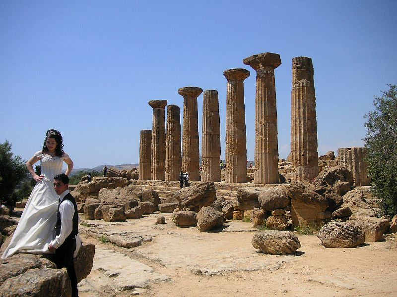 「神殿の谷」は、谷といっても実際には小高い丘の上にある。10を超えるギリシア時代の神殿が集積しており、オリーブの木に囲まれ、遠方には青い海が見える。丘の上に遮蔽物は殆ど無く、強烈な太陽が照りつける。まさに、以前訪れたアテネのアクロポリスを思い起こさせる。入口近くのヘラクレス神殿の列柱の前では、タキシードとウェディングドレスに装った若い男女が、カメラの前でポーズを取っている。地元の若者の記念撮影かもしれないが、宣伝用かもしれない。いずれにしても、「花嫁」の純白のドレスが古代の遺跡と抜けるように青い空によく映えている。